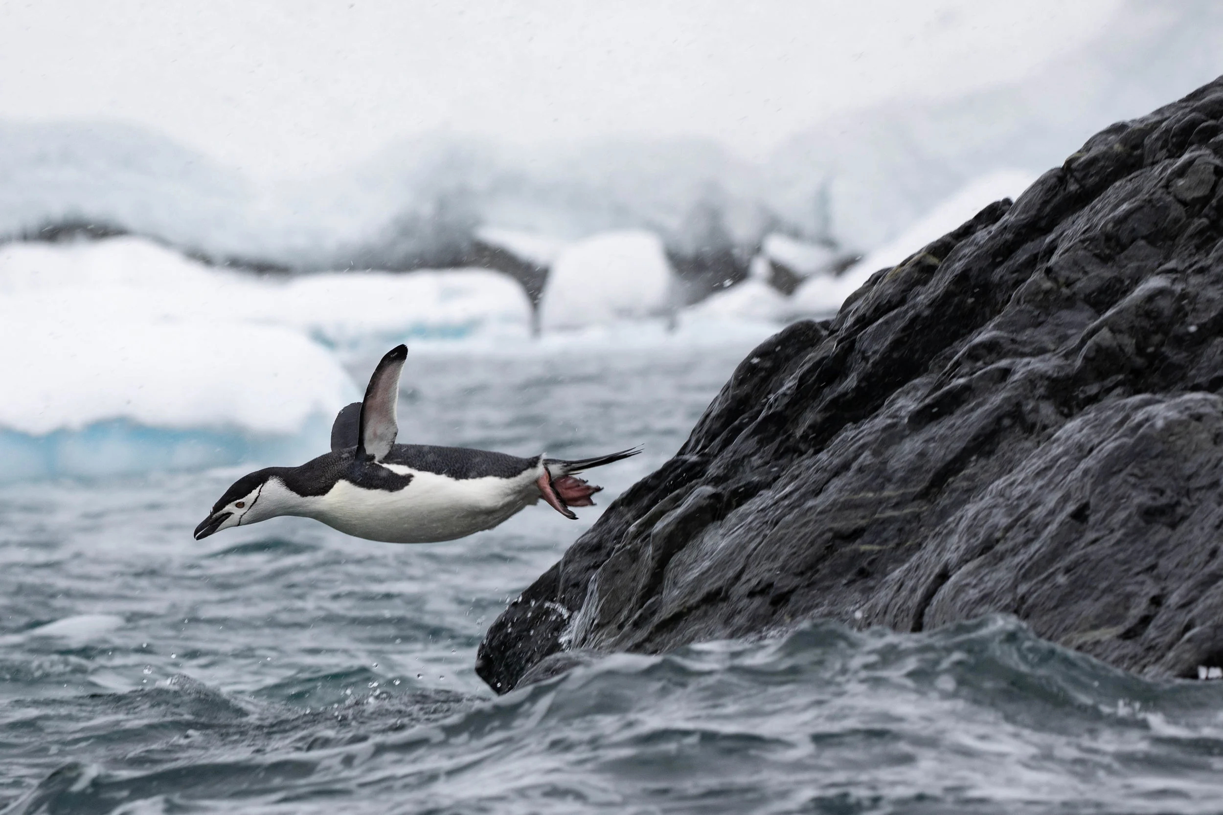Dive The image shows a Chinstap Penguin diving into the dark, aggressive waves without hesitation. Well, with maybe just a little hesitation...